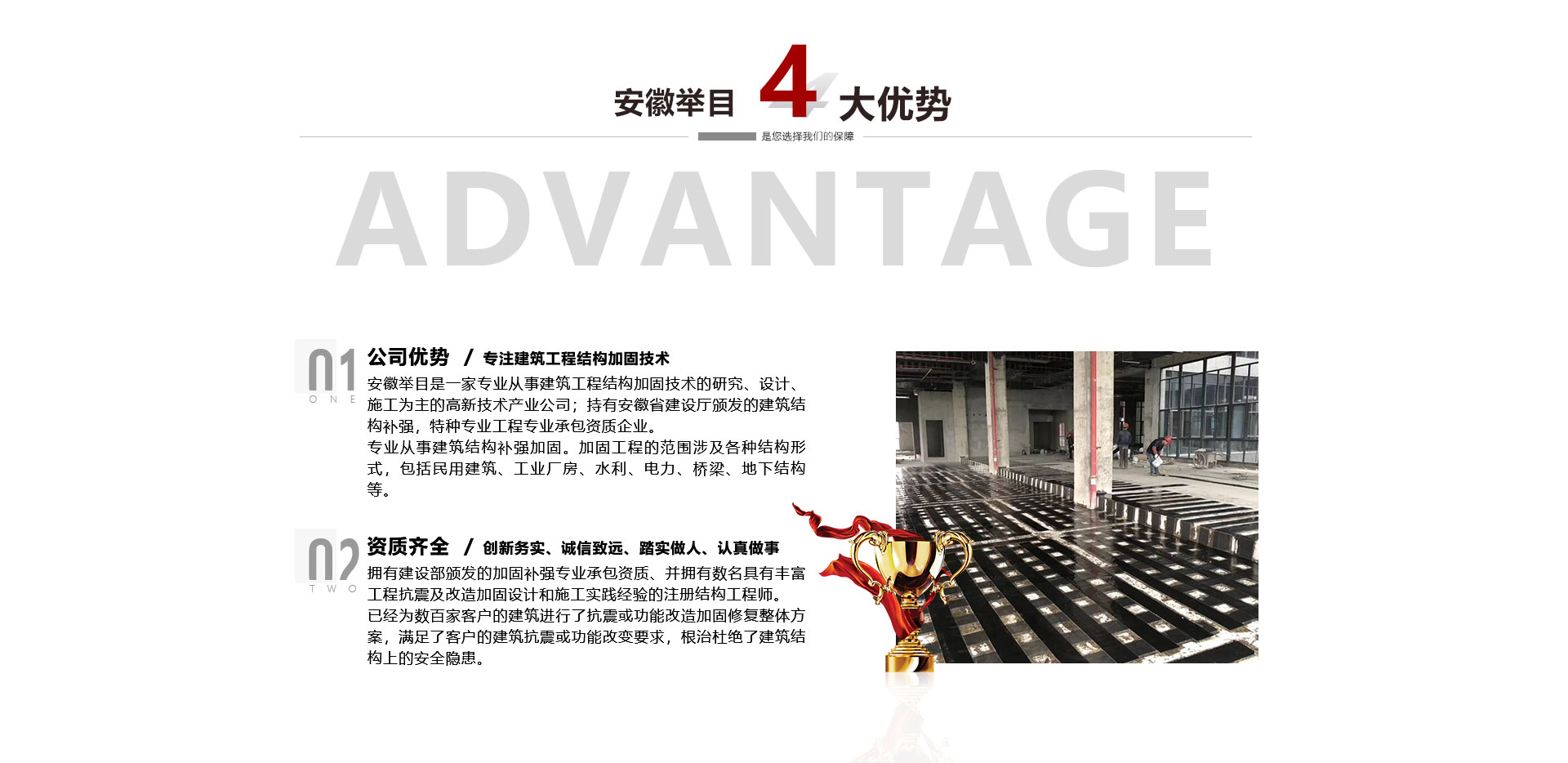 安徽舉目工程加固有限公司是一家專業(yè)從事建筑工程結(jié)構(gòu)加固技術(shù)的研究、設(shè)計(jì)、施工為主的高新技術(shù)產(chǎn)業(yè)公司,成立于2012年。持有安徽省建設(shè)廳頒發(fā)的建筑結(jié)構(gòu)補(bǔ)強(qiáng),特種專業(yè)工程專業(yè)承包資質(zhì)企業(yè)。專業(yè)從事建筑結(jié)構(gòu)補(bǔ)強(qiáng)加固。加固工程的范圍涉及各種結(jié)構(gòu)形式,包括民用建筑、工業(yè)廠房、水利、電力、橋梁、地下結(jié)構(gòu)等。公司依托高校土木建筑學(xué)院、省建筑科學(xué)研究機(jī)構(gòu)專業(yè)從事建筑結(jié)構(gòu)加固、檢測、鑒定、設(shè)計(jì)、施工、公司擁有建設(shè)部頒發(fā)...